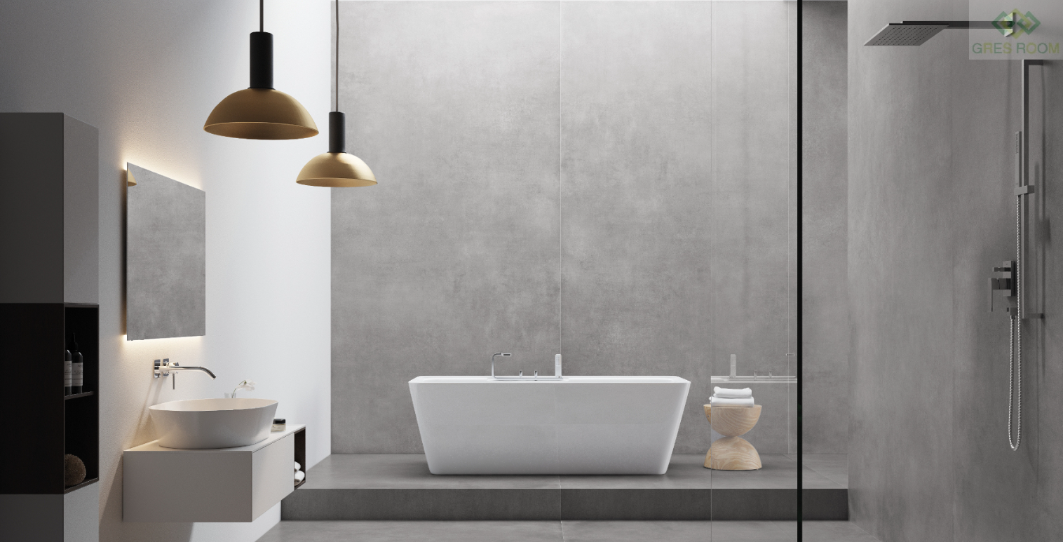 Efekt betonu nadaje powierzchni surowy i wyrafinowany charakter. Duży rozmiar elementu sprawia, że pomieszczenia wydają się przestronniejsze, a ograniczona liczba fug zapewnia spójność całego wnętrza. Płytki sprawdzają się w salonie, kuchni, łazience oraz w obiektach komercyjnych jak restauracje czy galerie handlowe.