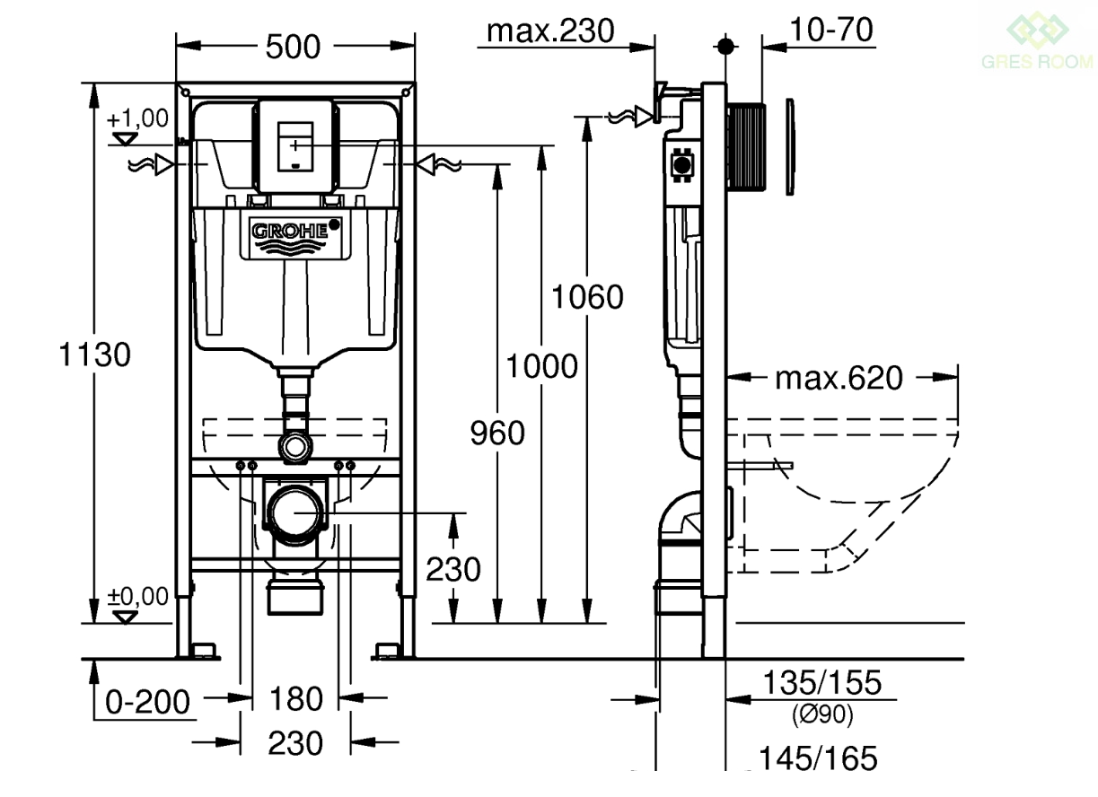Stelaż z serii Rapid SL przystosowany jest do montażu przyściennego lub w ścianie szkieletowej, do suchej zabudowany jak i do miski wiszącej o rozstawie otworów 18 cm lub 23 cm. Spłuczka uruchamiana jest od przodu lub od góry. Spłukiwanie można ustawiać w zakresie 6-9 litrów. Zawór odpływowy ma trzy funkcje: spłukiwanie dwudzielne, Start/Stop oraz bez przerywania. W stelażu zastosowano pełną izolację przeciwroszeniową. Pionowy przycisk uruchamiający jest przeznaczony do uruchamiania 2-pojemnościowego lub Start/Stop, do pneumatycznego zaworu spłukującego AV1. Ma on wymiary 156 x 197 mm. Pionowy lub poziomy montaż przycisku jest intuicyjny. Wyposażony jest w system ABS oraz powłokę chromową GROHE StarLight. Zastosowana technologia GROHE EcoJoy zapewnia widocznie mniejsze zużycie wody. Znajdujący się w zestawie System Grohe Fresh to unikatowy system odświeżania toalety, który znacznie poprawia komfort użytkowania. Kątowniki i wsporniki do montażu można regulować w zakresie 130-230 mm. Podkładka wyciszająca do WC będąca częścią zestawu idealnie dopełnia cały komplet dodatkowo zwiększając przyjemność dla użytkownika.