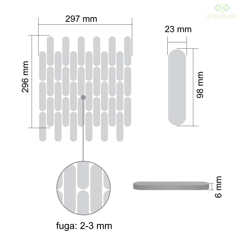 - Wymiar arkusza mozaiki: 297 x 296 mm (0.087 m2)